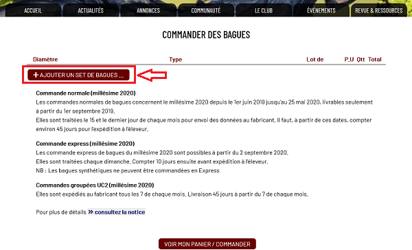 - La page pour commander des bagues s’ouvre. En cliquant sur Ajouter un set de bagues, cela vous permettra de choisir le diamètre de bague que vous voulez, le type de bagues (fermée, ouverte, couleur ou non…) et le nombre de set… Je vais prendre l’exemple des bagues de diamètre 4.5 mm (perruche catherine) et je désire commander un seul jeu de bague (à vous de bien choisir le bon diamètre en fonction de votre espèce).