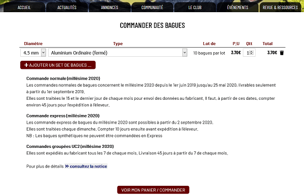 - La dernière étape consiste à régler la commande. Deux option s’offre à vous. Un régalement sur le champ par carte bancaire ou par chèque. Après avoir finalisé votre commande, un numéro d’éleveur vous sera attribué à la réception de vos bagues.